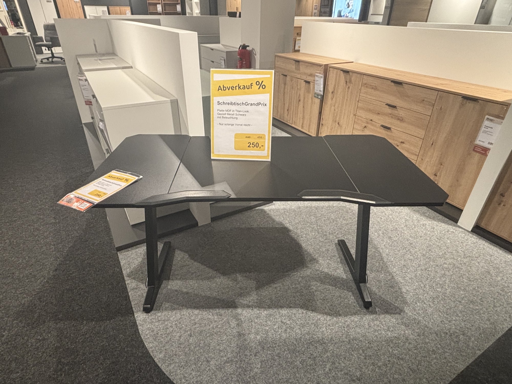 Moderner Schreibtisch mit MDF-Platte im Titan-Look und schwarzem Metallgestell. Inklusive integrierter Beleuchtung für eine stilvolle Optik und angenehmes Arbeiten. Jetzt zum attraktiven Abverkaufspreis.