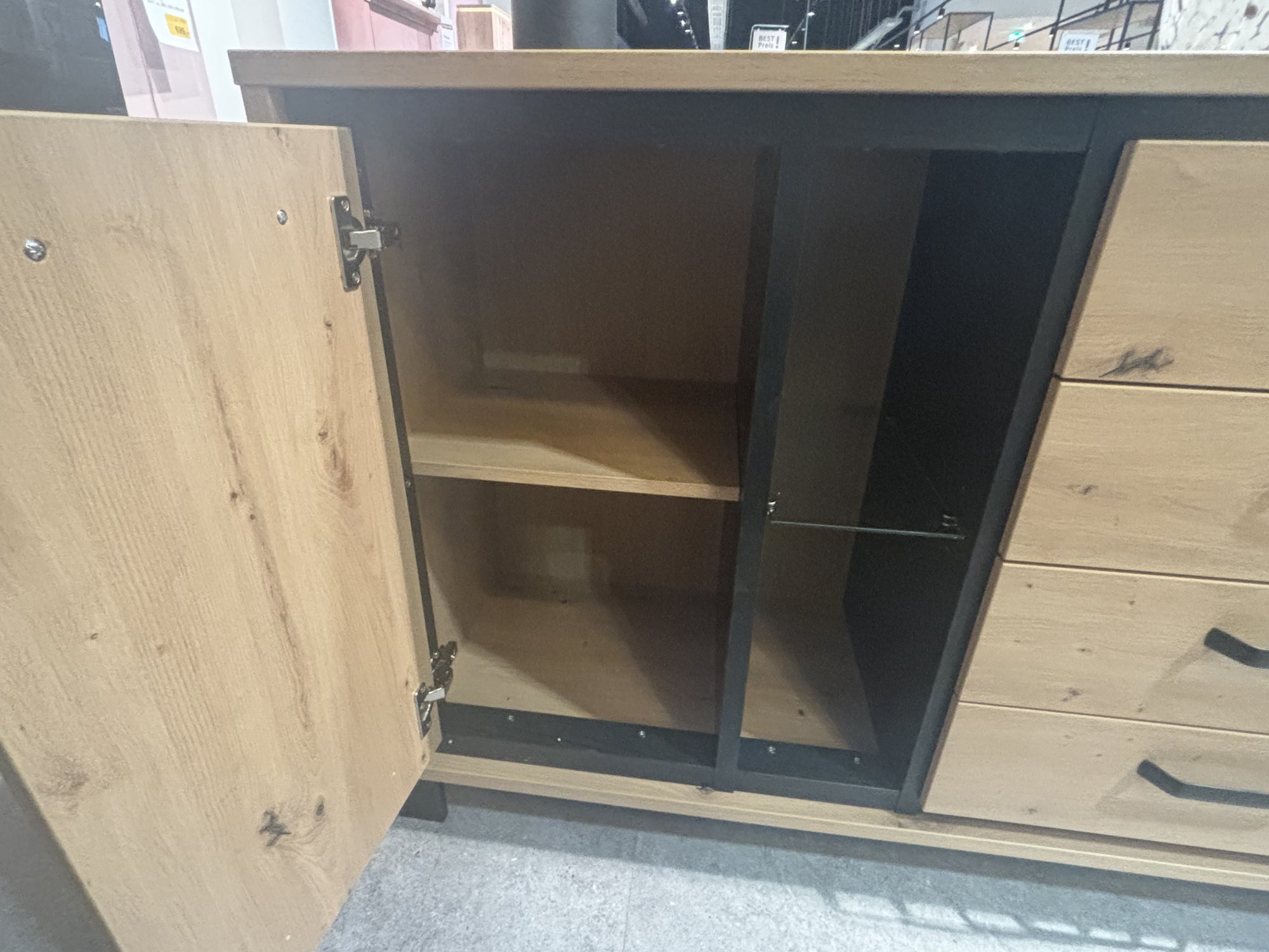 Stilvolle Kommode mit Front und Korpus in Artisan Eiche Nb. und eleganter schwarzer Absetzung. Sie verfügt über 2 Türen und 4 Schubkästen und bietet viel Stauraum für Wohn- oder Schlafzimmer.