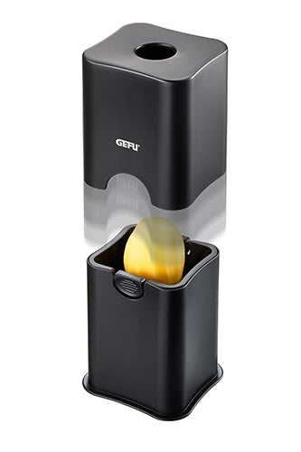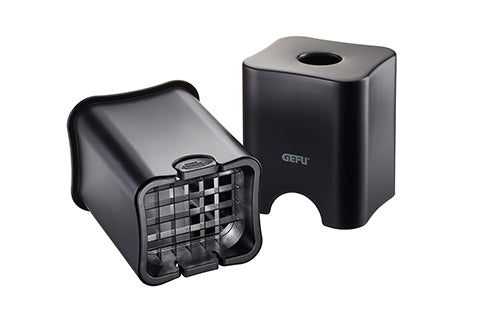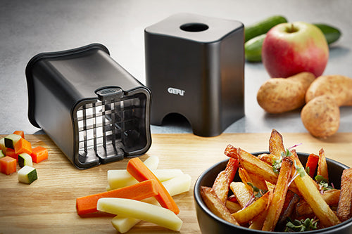 Kurz drücken statt lange schnippeln: POMCUT ist die kleine Zauberkiste für alle Kochkünstler, die Kartoffeln, Gemüse oder Obst in schlanke Stifte oder wunderbar gleichmäßige Würfel verwandeln möchten. Der POMCUT besteht aus einem standfesten Sockel mit Schneidgitter und einem Stößer. Um leckere Pommes oder knackige Gemüsesticks zu erhalten, legt man Kartoffel, Gurke oder Möhre einfach auf das Schneidgitter und drückt sie mit dem Stößer durch die scharfen Klingen nach unten. Voilá! Genauso einfach und bequem macht der POMCUT aus Obst- oder Gemüsescheiben perfekte Würfel für kunterbunte Eintöpfe und Obstsalate oder dekorative Croutons aus Toastbrot. Durch sein kompaktes, platzsparendes Design findet der POMCUT problemlos Platz in jeder Küche.