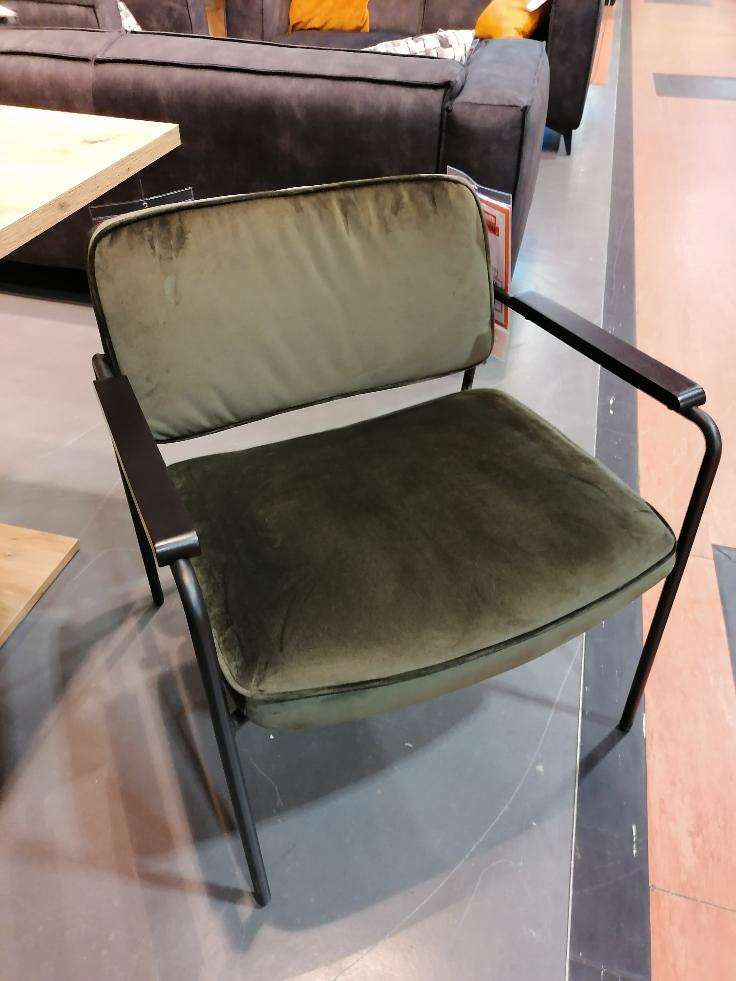 Loungestuhl mit dunkelgrünem Stoffbezug, schwarzem Metallgestell und schwarzen, gebürsteten Rubberwood-Armlehnen – stilvoll, bequem und modern.