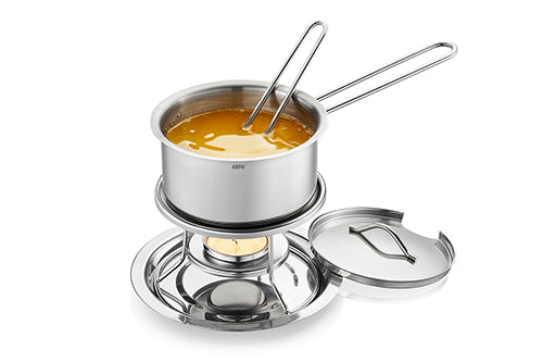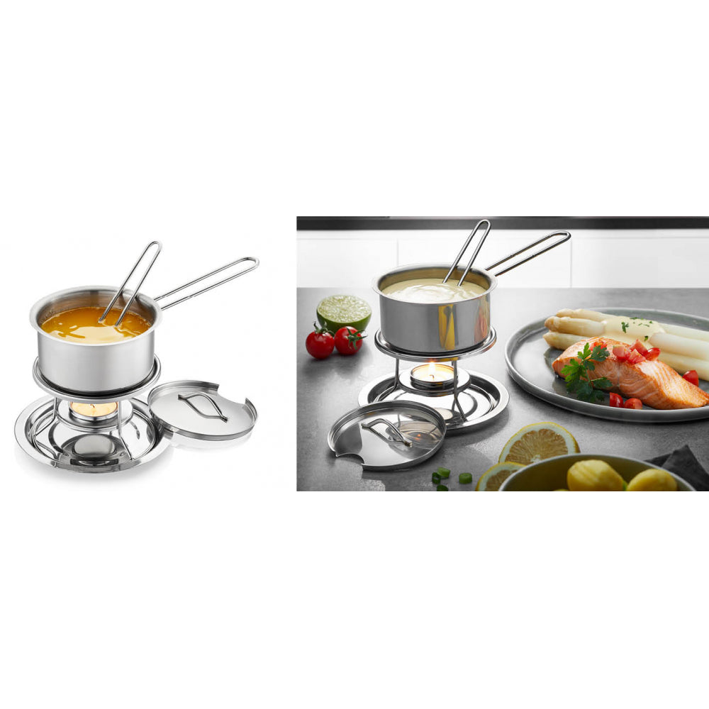 • 6-teiliges Set mit Stövchen zum Warmhalten von Saucen und flüssiger Butter • Füllvolumen: 300 ml • inkl. Stövchen, Teelicht, Stieltopf mit Deckel, Servierlöffel • Stieltopf, Deckel und Servierlöffel spülmaschinengeeignetPFLEGEHINWEIS