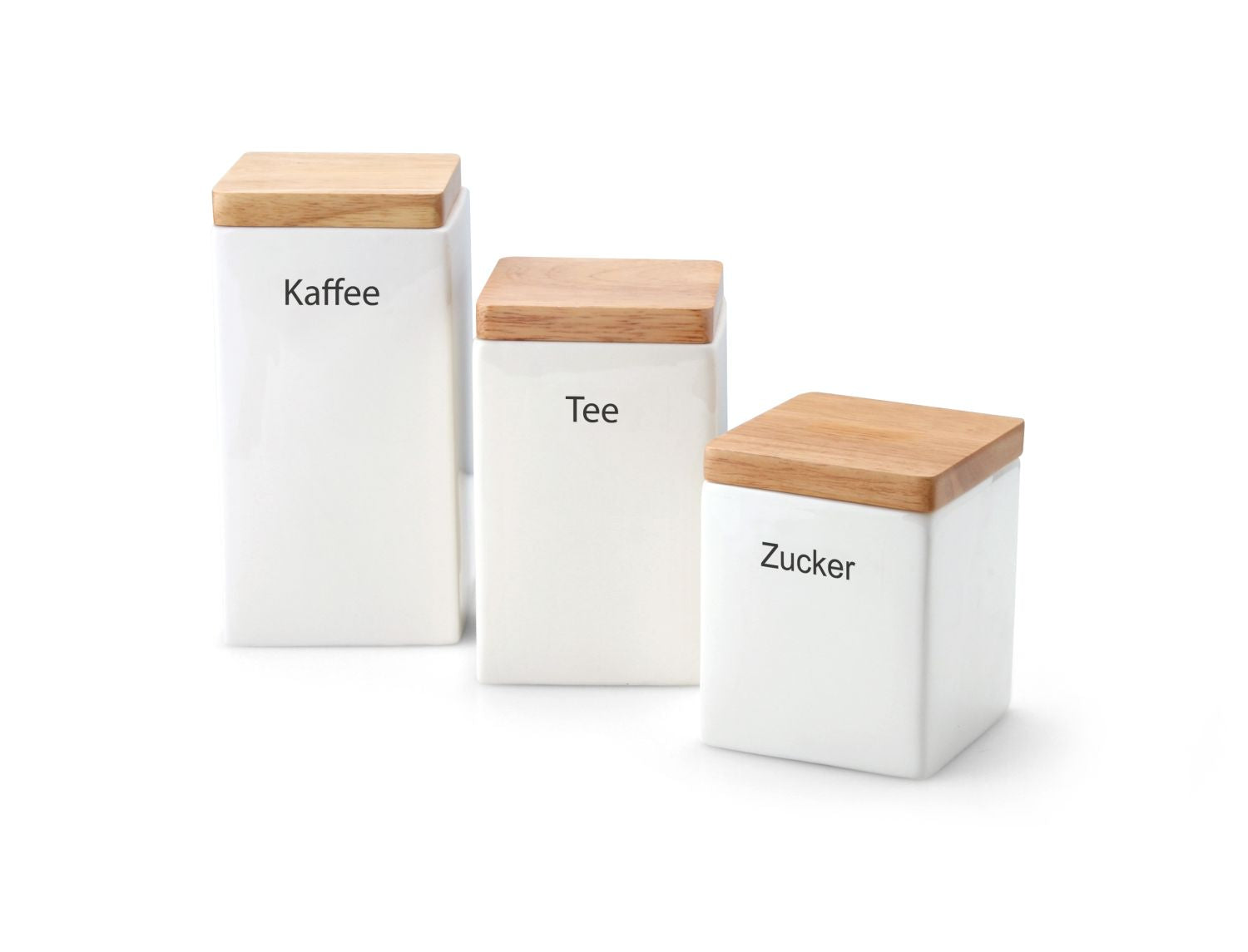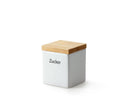 Die praktische Vorratsdose aus weißer Keramik passt mit dem hellen Holzdeckel in jede Küche. Damit alles gut verschlossen bleibt, ist im Deckel ein Siliconring integriert. Die Änderung der Beschriftung ist kein Problem - innen liegen Etiketten mit alternativen Beschriftungen.