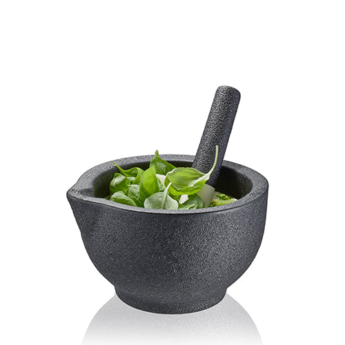 • zum Zermahlen von Gewürzen und Kräutern, z.B. für die Zubereitung von individuellen Gewürzmischungen oder frischem Pesto • 2tlg. Set: Schale und Stößel • perfektes Mahlergebnis durch aufgeraute Oberfläche • mit Ausgießnase • edle Gussoptik und griffige Haptik durch Oberflächenbeschichtung • handgefertigtPFLEGEHINWEIS