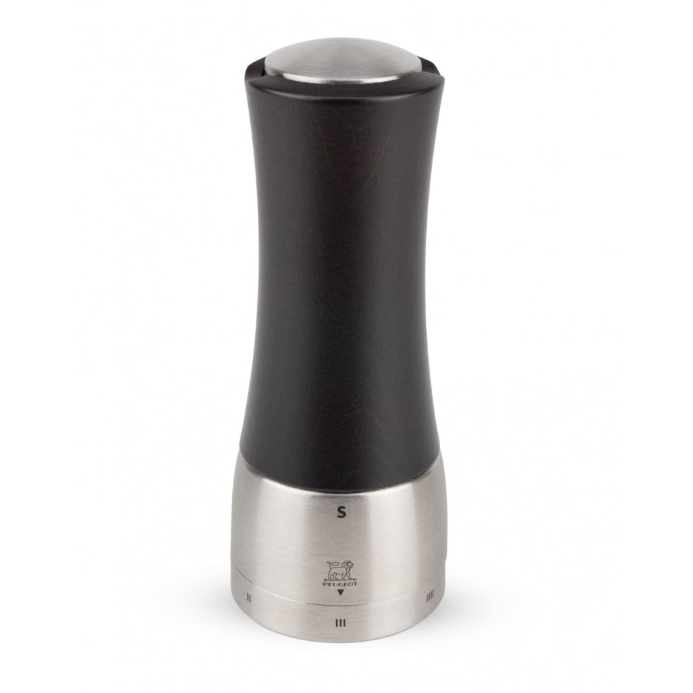Die schokoladenfarbene Salzmühle Madras verbindet stilvoll und modern zwei hochwertige Werkstoffe miteinander: Holz und Edelstahl. Die Salzmühle Madras ist der perfekte Begleiter beim Würzen Ihrer kulinarischen Schöpfungen und absolut komfortabel im Gebrauch. Die 16 cm große Mühle weist eine absolute Neuheit auf, die das Befüllen des Vorratsbehälters erleichtert und gleichzeitig das Fassungsvermögen für Salz erhöht: den Wegfall der vertikalen Mittelachse! Darüber hinaus ist sie mit dem patentierten Einstellsystem U’Select für den Mahlgrad ausgestattet. Der Mahlgrad für Salz kann somit einfach an das zubereitete Gericht angepasst werden. Ausgerüstet mit dem Salzmahlwerk von Peugeot, auf das in Deutschland eine 25-jährige Garantie gewährt wird. Wählen Sie einen groben Mahlgrad für Fleisch und Stopfleber.