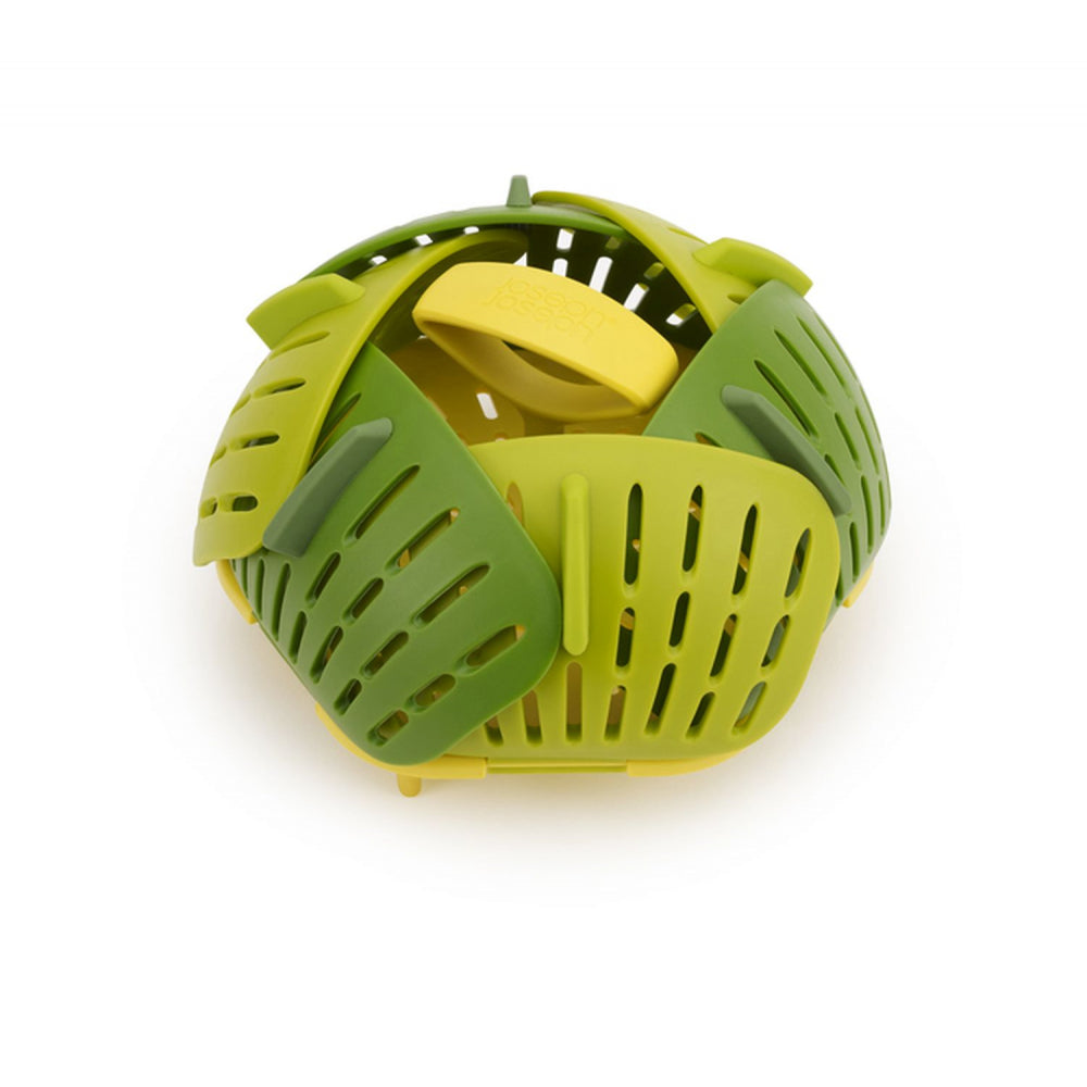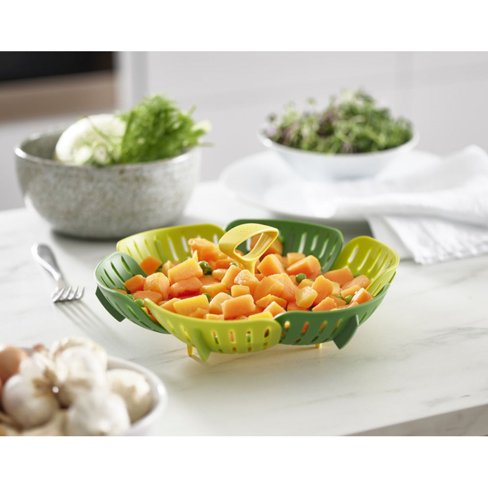 Mit seinen selbstausrichtenden Seiten, hitzebeständigen Silikonfüßen und Silikon-Seitenflossen ist dieser faltbare Dampfgareinsatz perfekt für die Verwendung mit Antihaft- und Edelstahlgeschirr geeignet. Er verfügt über einen leicht anhebbaren Bügel für eine sichere Entnahme, bietet bei voller Öffnung eine große Kapazität und lässt sich für eine kompakte Lagerung ordentlich zusammenklappen. Spülmaschinenfest.