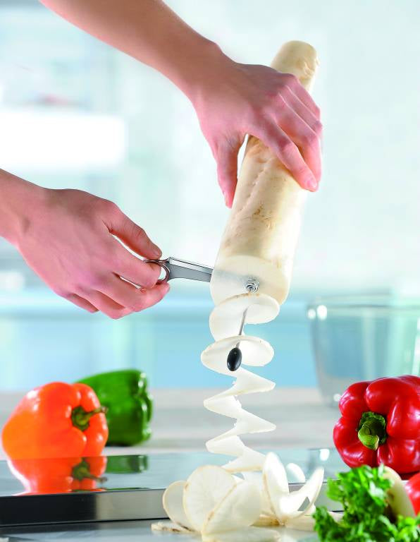 • dekorative Spiralen aus Rettich und anderen festen Gemüsen • Haltestab für schnelles Schneiden • Fingerschutz für sicheres Schneiden