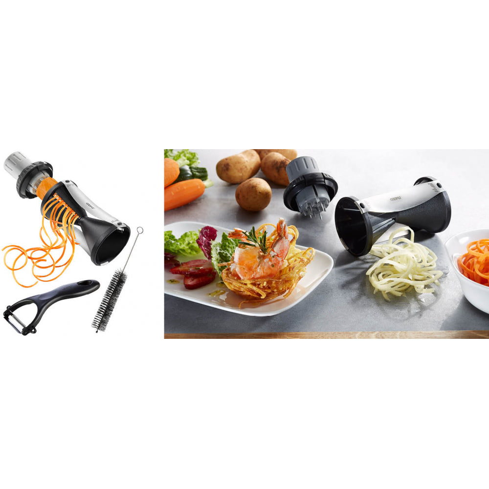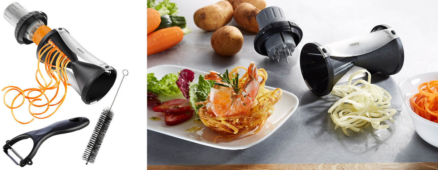 • Reinigungsbürste, Schäler inklusive • einrastender Gemüsehalter mit 3 Edelstahlstiften sorgt für sicheren Halt von Anfang an • für Gemüse bis 5 cm Ø • 2 Juliennegrößen: 2 x 3 mm, 3,5 x 5 mm