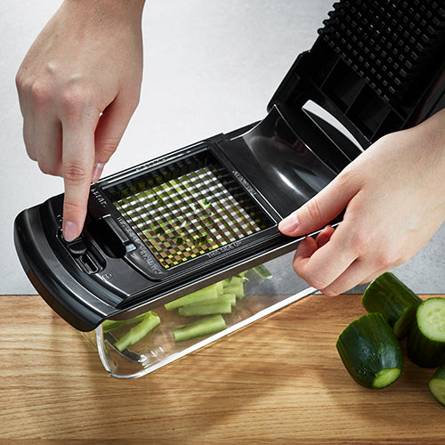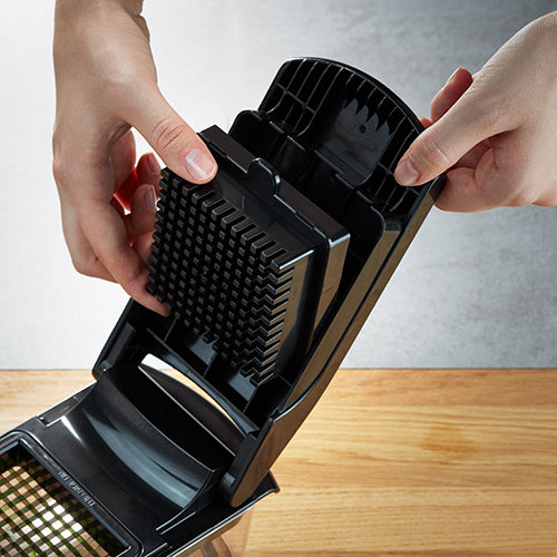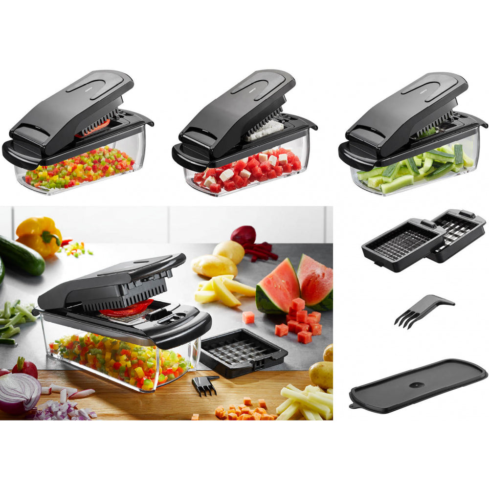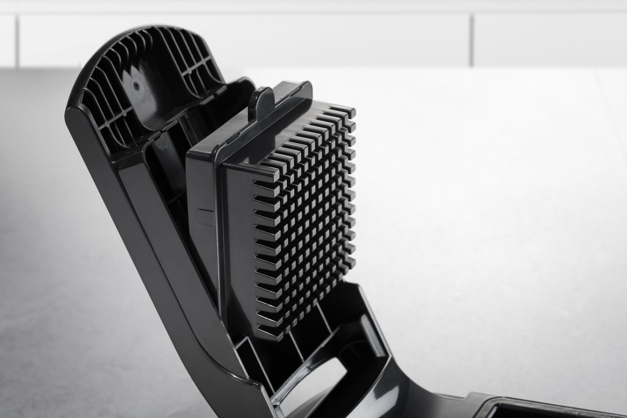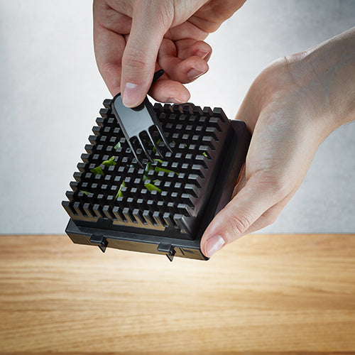 • 2 austausch- und arretierbare Schneidgitter für feine (7 x 7 mm) und grobe (13 x 13 mm) Stifte oder Würfel • zerlegbar zur leichten Reinigung • Aufbewahrungsdeckel und Reinigungskamm inklusive • Antirutschfüße • Füllvolumen: 1000 ml