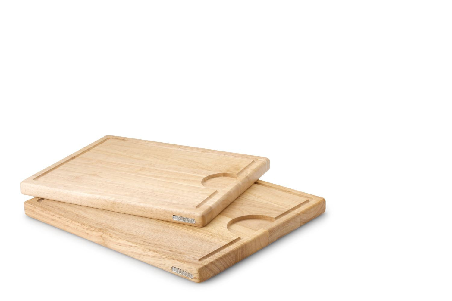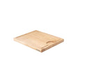 Hochwertig verarbeitetes massives Schneidebrett in modernem Design mit hoher Materialstärke, Oberseite mit Saftrille und großer Auffangmulde, Unterseite glatt und als klassisches Schneidebrett nutzbar