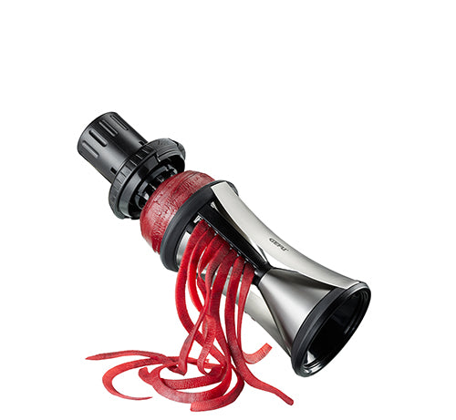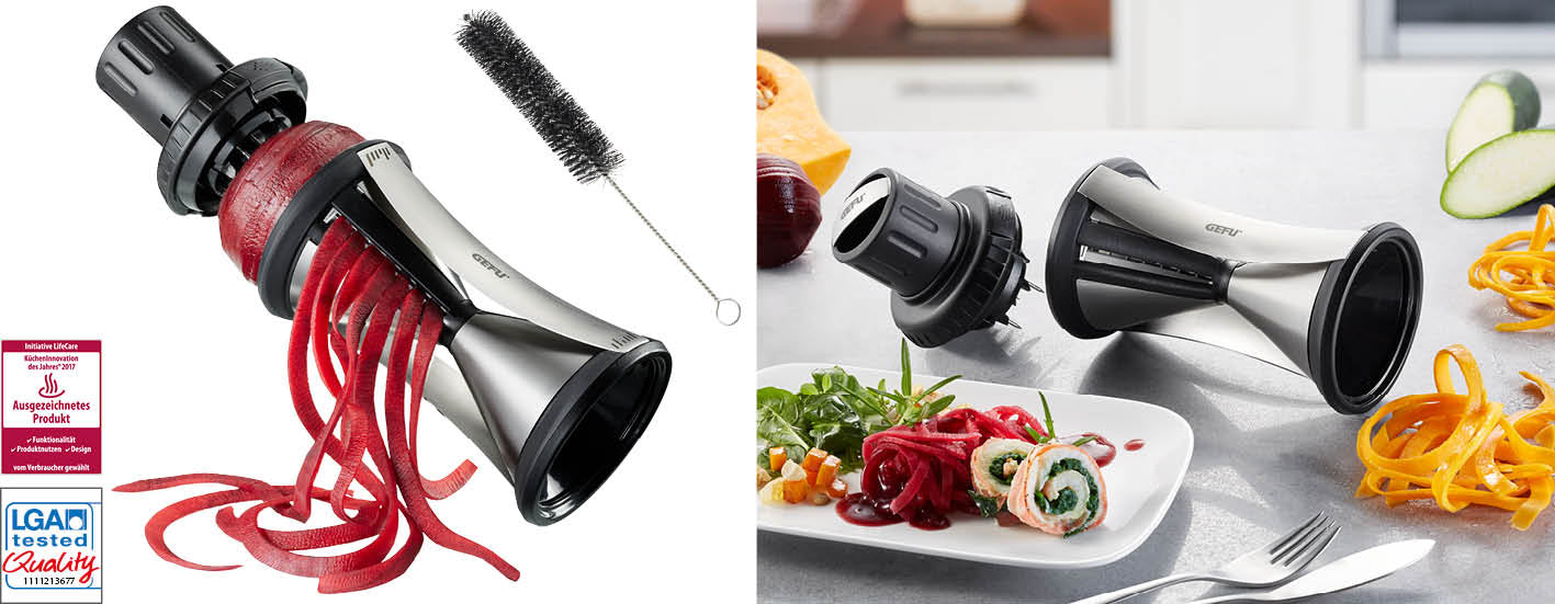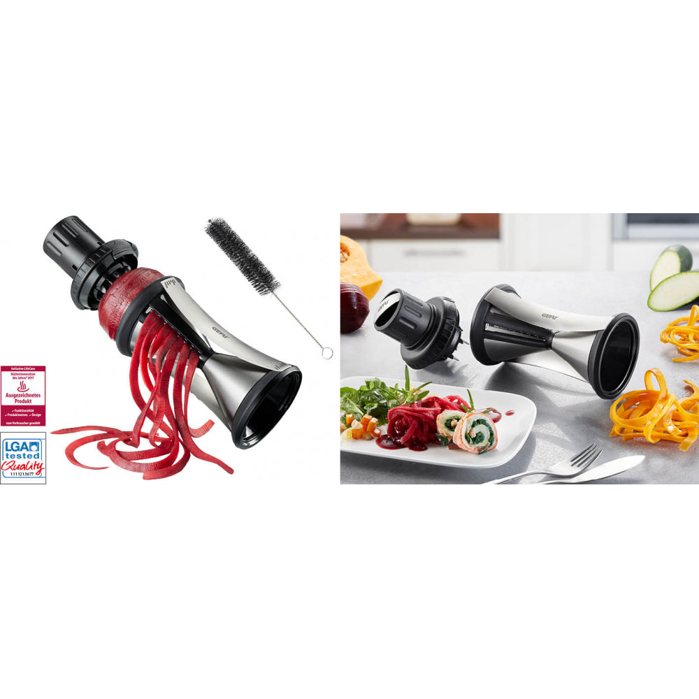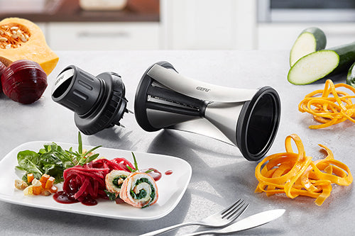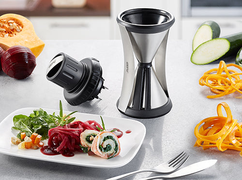 Hochwertige Materialien und ein edles Design zeichnen den SPIRELLI® XL neben seiner einfachen Anwendung aus. Im Handumdrehen zaubert er aus Gemüse mit bis zu 6,5 cm Durchmesser appetitliche Julienne-Endlos-Spiralen in den Größen 2 x 4,5 mm und 3 x 8 mm. Die perfekte Funktionalität zeigt sich in der Anwendung: Der einrastende Gemüsehalter mit drei Edelstahlstiften sorgt neben einem sicheren Halt von Anfang an auch – dank seines nachschiebbaren Stempels - für eine effiziente Ausnutzung des Gemüses. Um den Spiralschneider nach Gebrauch einfach zu säubern, ist eine Reinigungsbürste gleich mit dabei.