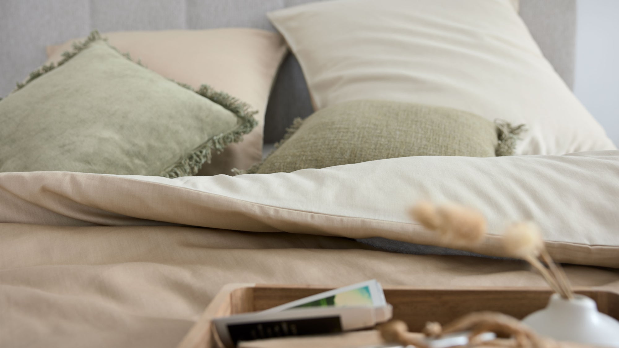 Details anthrazitfarbener Baumwollsatin, kombiniert mit Sand zweiteiliges Wende-Bettwäsche-Set ein Kopfkissenbezug und ein Bettbezug mit verdeckten Reißverschlüssen das Set kann bei 60 Grad in der Waschmaschine gewaschen werden - am besten mit ähnlichen Farben und auf links bei geringer Hitze im Trockner getrocknet, lassen sich eventuelle Falten bis Stufe 3 wieder wegbügeln Bleichen und chemisch reinigen vertragen die Materialien nicht Abmessungen Kopfkissen ca. 80 x 80 cm (BxL) Bettbezug ca. 135 x 200 cm (BxL) Das ist besonders: die Bettwäsche ist in zwei Größen und verschiedenen Farbkombinationen erhältlich der Hersteller gewährt 5 Jahre Garantie