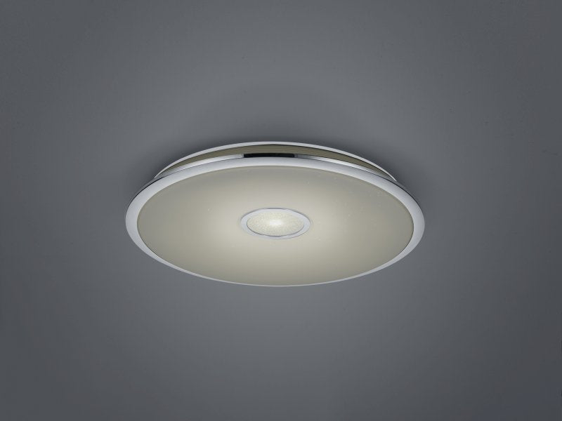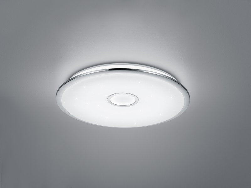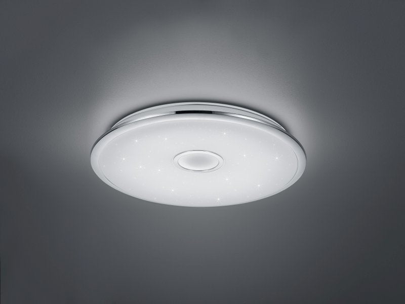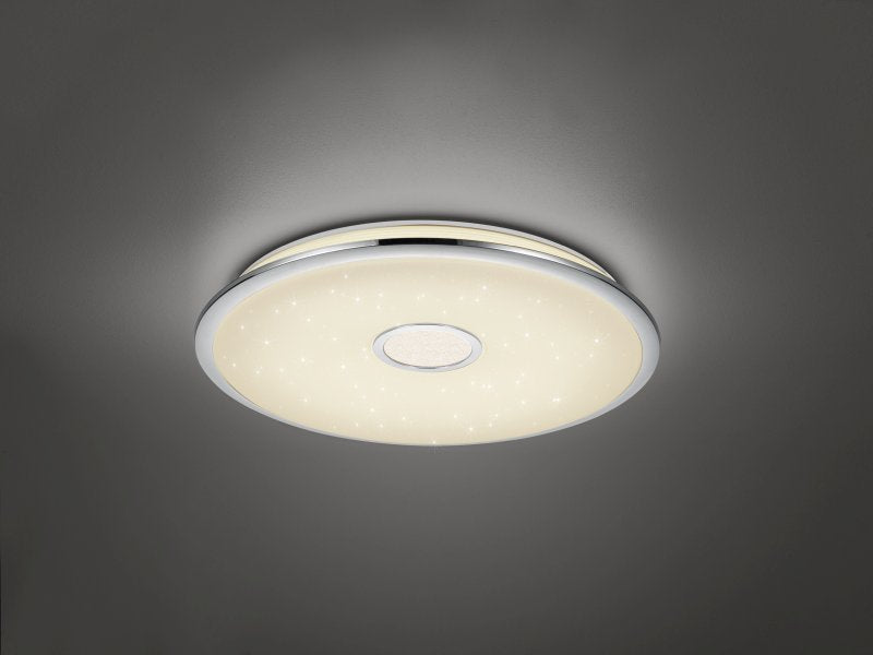 Holen Sie sich mit der Deckenleuchte OSAKA einen bezaubernden Sternenhimmel in Ihr Zuhause. Die Besonderheit der Leuchte ist nicht nur der Starlight-Effekt, sondern auch die im Lieferumfang enthaltene Fernbedienung mit der Sie die Leuchte nicht nur dimmen können, sondern auch die Lichtfarbe nach Ihren Wünschen einstellen oder bei Bedarf ein Nachtlicht einschalten können. Die Memory-Funktion macht es zudem möglich Ihre bevorzugten Einstellungen zu speichern. Die Leuchte hat einen Durchmesser von 60 cm und eignet sich deshalb auch hervorragend zur Beleuchtung von großen Räumen. Die Leuchte ist aus chromfarbigem Kunststoff und einem weißen Cover gefertigt und kann somit in jeden Einrichtungsstil integriert werden. Darüber hinaus verfügt die Leuchte über eine moderne LED Technologie, die sich durch eine hohe Lichtqualität und Energieeffizienz auszeichnet. Im Vergleich zu herkömmlichen Halogen Leuchtmitteln lassen sich bis zu 80% der Energiekosten sparen. Zusätzlich haben LED Lichtquellen eine lange Lebensdauer, produzieren weniger Wärme und schonen die Umwelt.