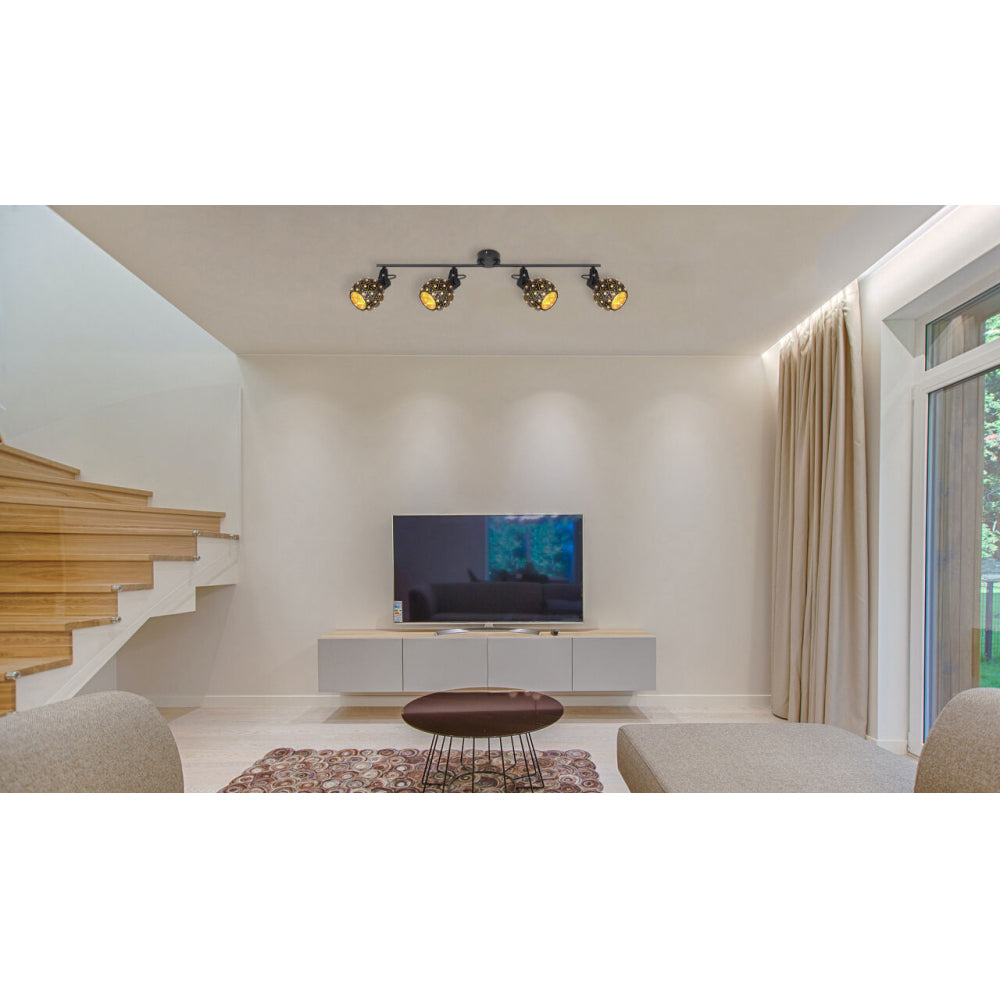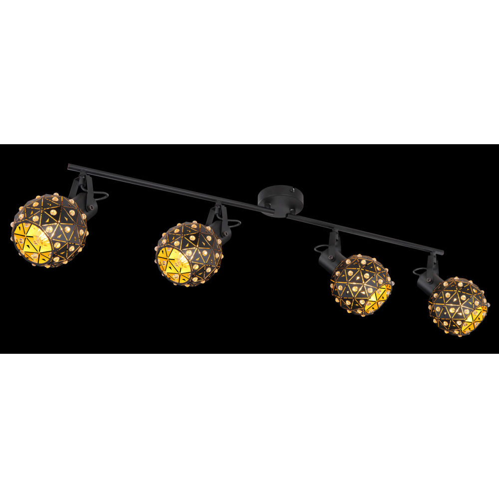 Ausgefallen und stilvoll beschreibt sich der vier flammige Strahler aus der Serie Jodie. Der schwarz matte Schirm ist mit vielen wunderschönen K9 Kristallen besetzt, die Ihrem Heim ein ganz besonderes Flair verleihen. Da das Leuchtmittel (E27 max. 40 W)frei wählbar ist, kann selbst entschieden werden in welcher Lichtfarbe bzw. Lichtstärke Ihre vier Wände erstrahlen. Des Weiteren sind die Schirme verstellbar um so ein optimales Lichtergebnis zu schaffen.