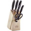 - 7‑teiliges Set mit Messerblock: Universalmesser, Spick‑ und Garniermesser, Fleischmesser, Kochmesser, Brotmesser plus Küchenschere – übersichtlich und sicher im Block verstaut.