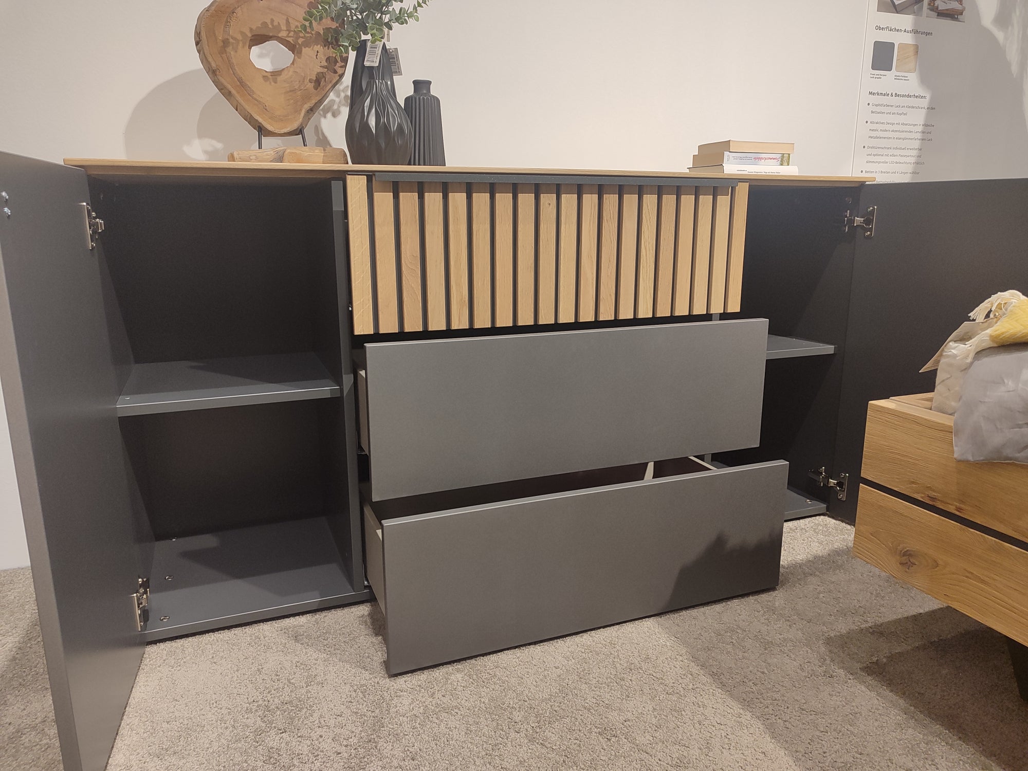Die graphitgraue, moderne Kommode mit Paneeloptik in Massivholz Wildeiche überzeugt mit drei Schubladen und zwei Türen – stilvoller Stauraum trifft auf zeitgemäßes Design und natürliche Akzente.