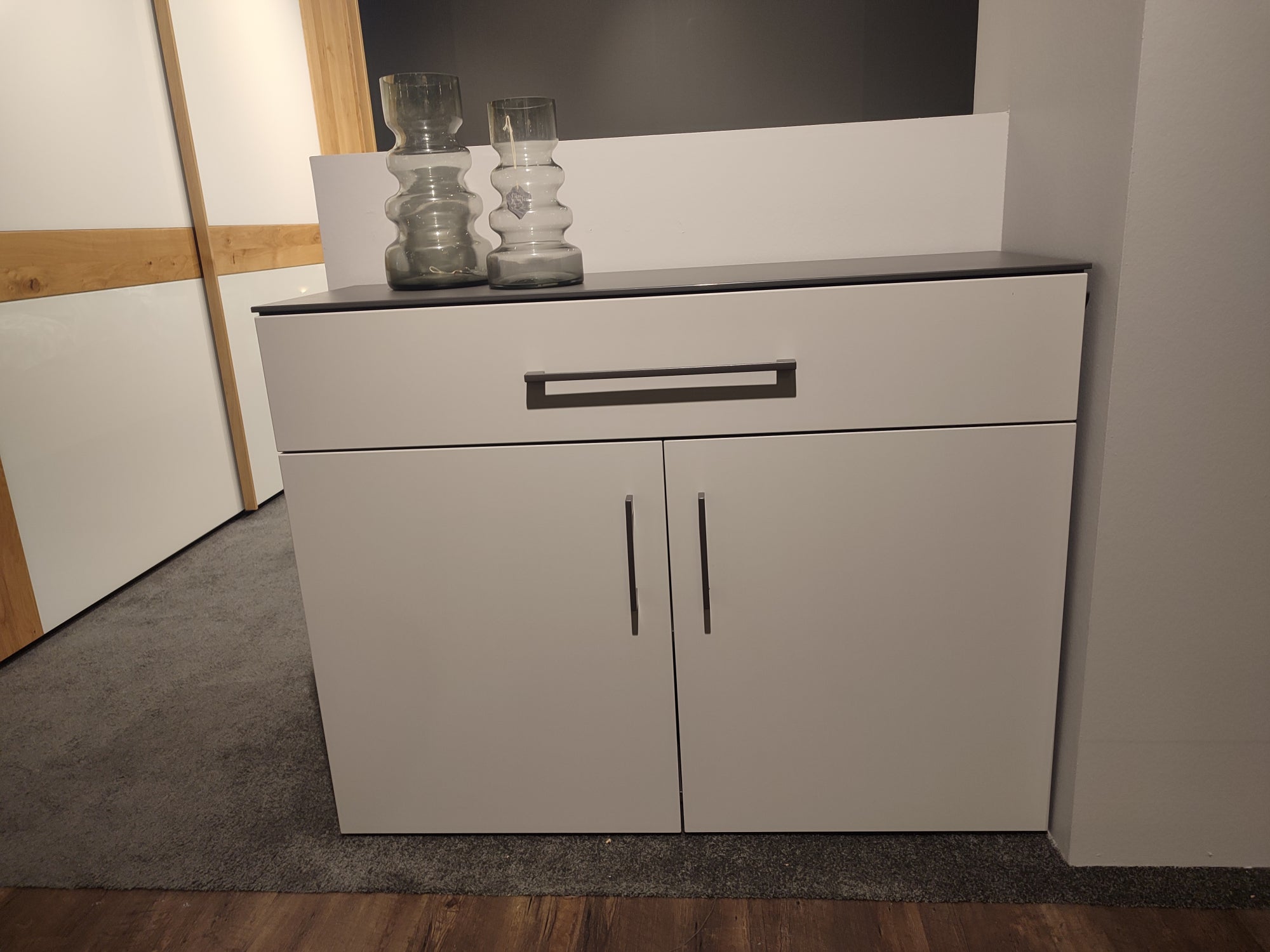 Die Kommode Next von Schlüter überzeugt mit einem modernen Korpus in Schiefergrau und einer stilvollen Front in Lichtgrau. Anthrazitfarbene Griffe setzen markante Akzente und unterstreichen das zeitgemäße Design. Mit einem Schubkasten und zwei Türen bietet sie praktischen Stauraum für vielseitige Einsatzbereiche.