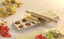 • gleichzeitige Herstellung von 12 eckigen Ravioli / Maultaschen • Antihaftbeschichtung • 3-tlg. Set: Ravioli-/ Maultaschenbrett, Kunststoffeinsatz zum Muldenformen, Holzrolle