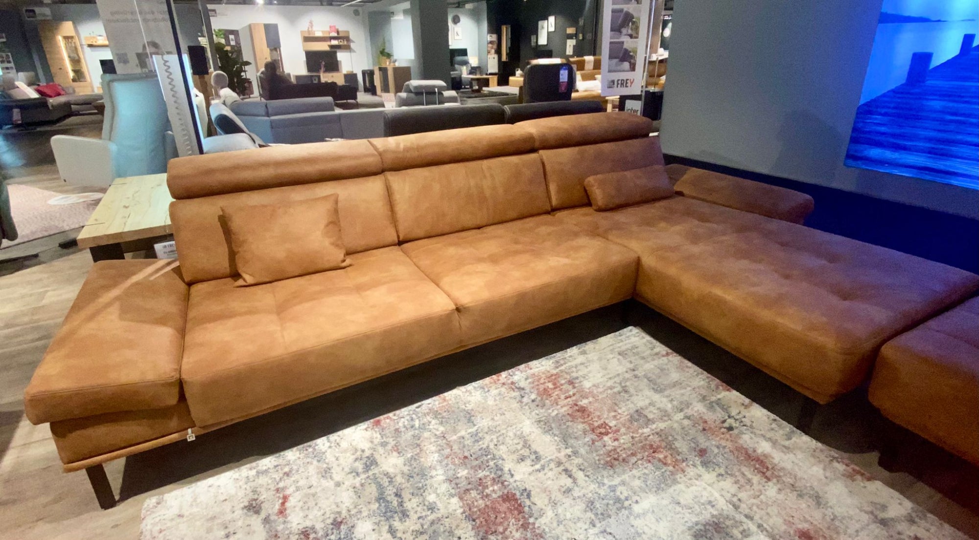 Die Interliving Sofa Serie 4254 ist ein individuell planbares Polstermöbelprogramm mit einem umfangreichen Typenplan. Dabei stehen qualitativ erstklassige Stoff- und Lederbezüge in verschiedenen Farben zur Wahl. Zu den optischen Highlights gehört die aufwendige Doppelnaht. Sie ist auf Wunsch auch in Kontrastfarbe umsetzbar. Hinsichtlich der Füße sind Varianten aus Holz oder Metall erhältlich. Des Weiteren kann die Sitzfläche glatt oder mit einer markanten Sitzsteppung bestellt werden. Auch funktional lassen sich die Möbel aus der Interliving Sofa Serie 4254 gezielt an die eigenen Bedürfnisse adaptieren. Die hochwertige Polsterung ist in zwei komfortablen Sitzhärten realisierbar: Federkern oder weicherer Softsitz. Zudem sind zwei Sitzhöhen, ca. 43 oder 46 cm, wählbar. Die bequeme Sitztiefenverstellung ist bereits inklusive. Die Sofas sind inklusive Kopfteil- und Armteilverstellung, wodurch das Sofa noch gemütlicher und flexibler wird. Zugeteilt wurde eine Eckkombination bestehend aus einem großen Zweisitzer sowie einem breiten Longseat. Die Elemente sind jeweils mit dem tabakfarbenen Stoff Linato bezogen sowie mit schwarzen Metallfüßen ausgestattet. Für hohen Komfort sorgt der Softsitz mit Markenschaum.
