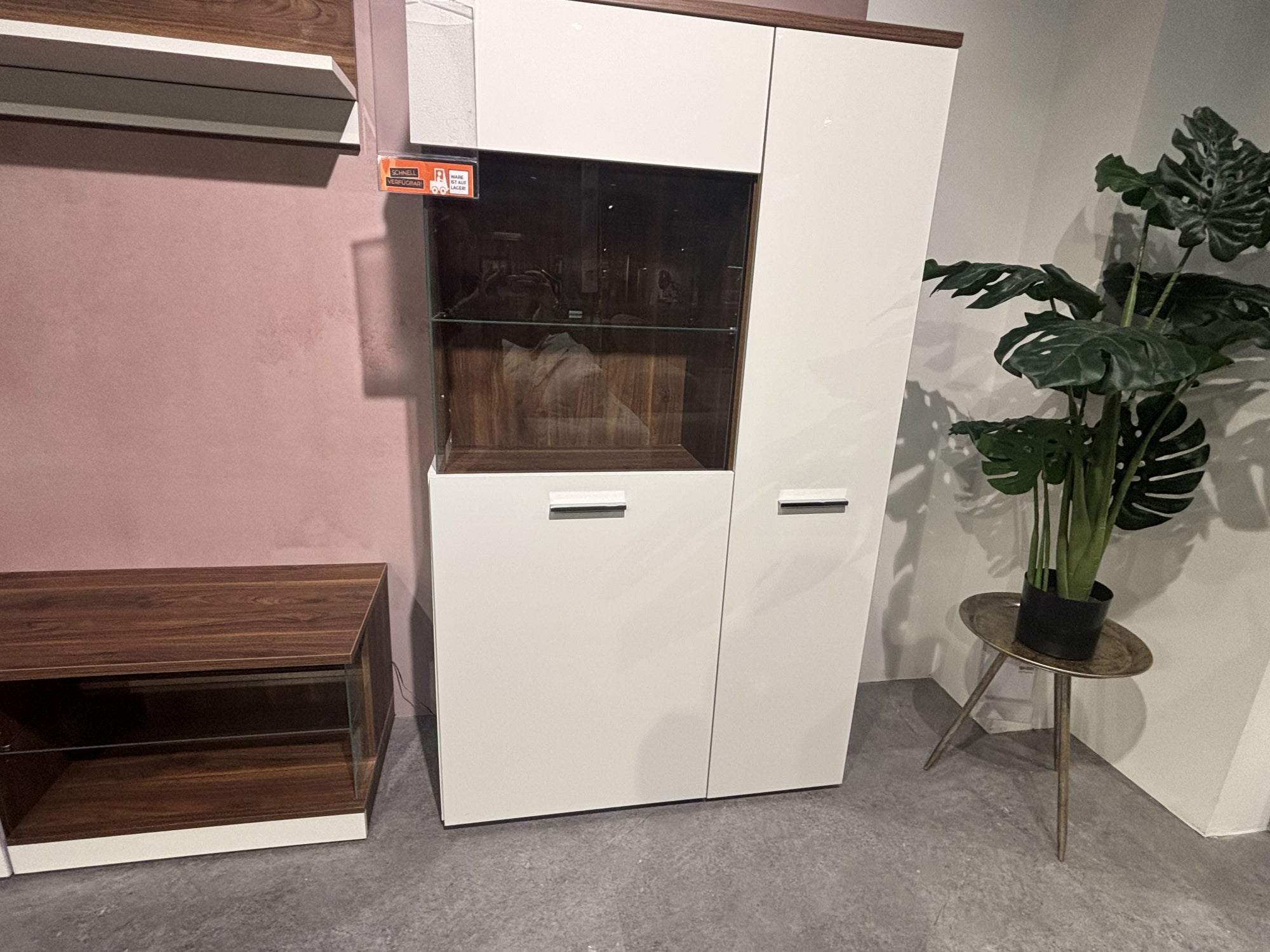 Moderne Vitrine in edler Bakerfield Walnuss Nachbildung mit eleganter Front in Weiß Hochglanz. Die stilvolle Farbkombination setzt dekorative Akzente und bietet gleichzeitig praktischen Platz für Bücher, Bilder oder Wohnaccessoires.