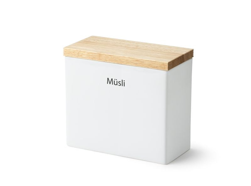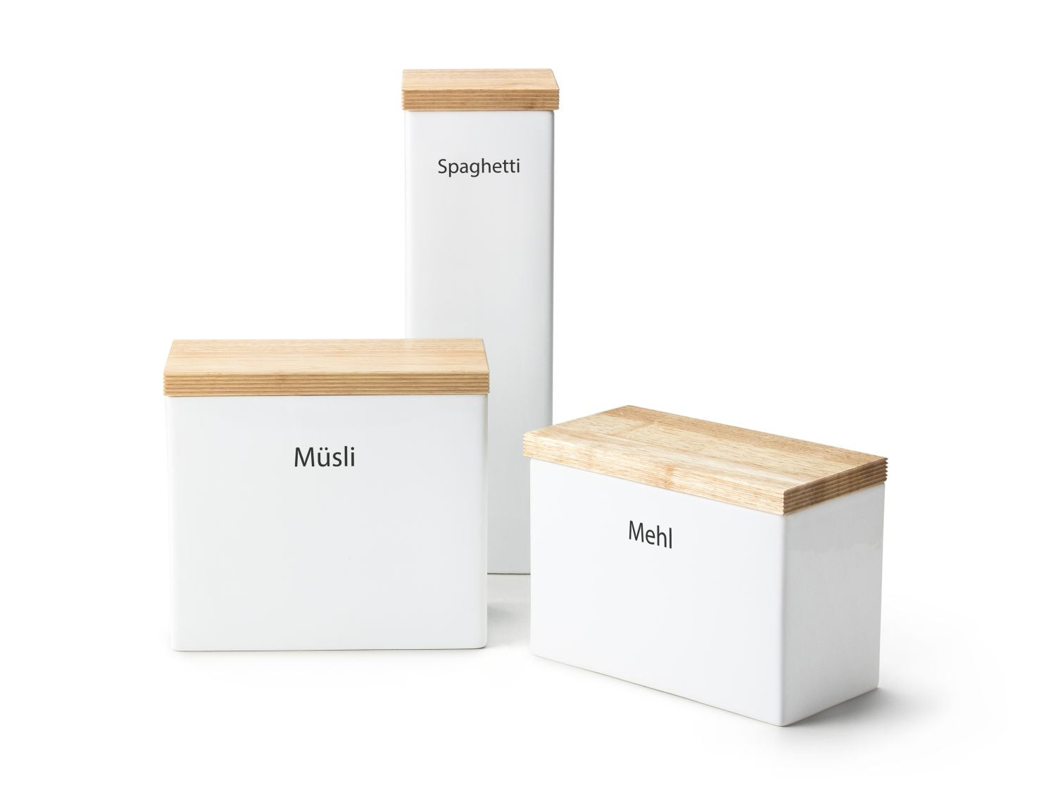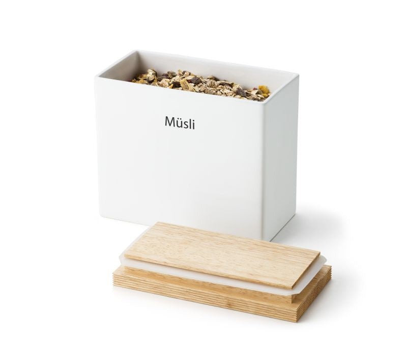 Die praktische Vorratsdose aus weißer Keramik passt mit dem hellen Holzdeckel in jede Küche. Damit alles gut verschlossen bleibt, ist im Deckel ein Siliconring integriert. Die Änderung der Beschriftung ist kein Problem - innen liegen Etiketten mit alternativen Beschriftungen.